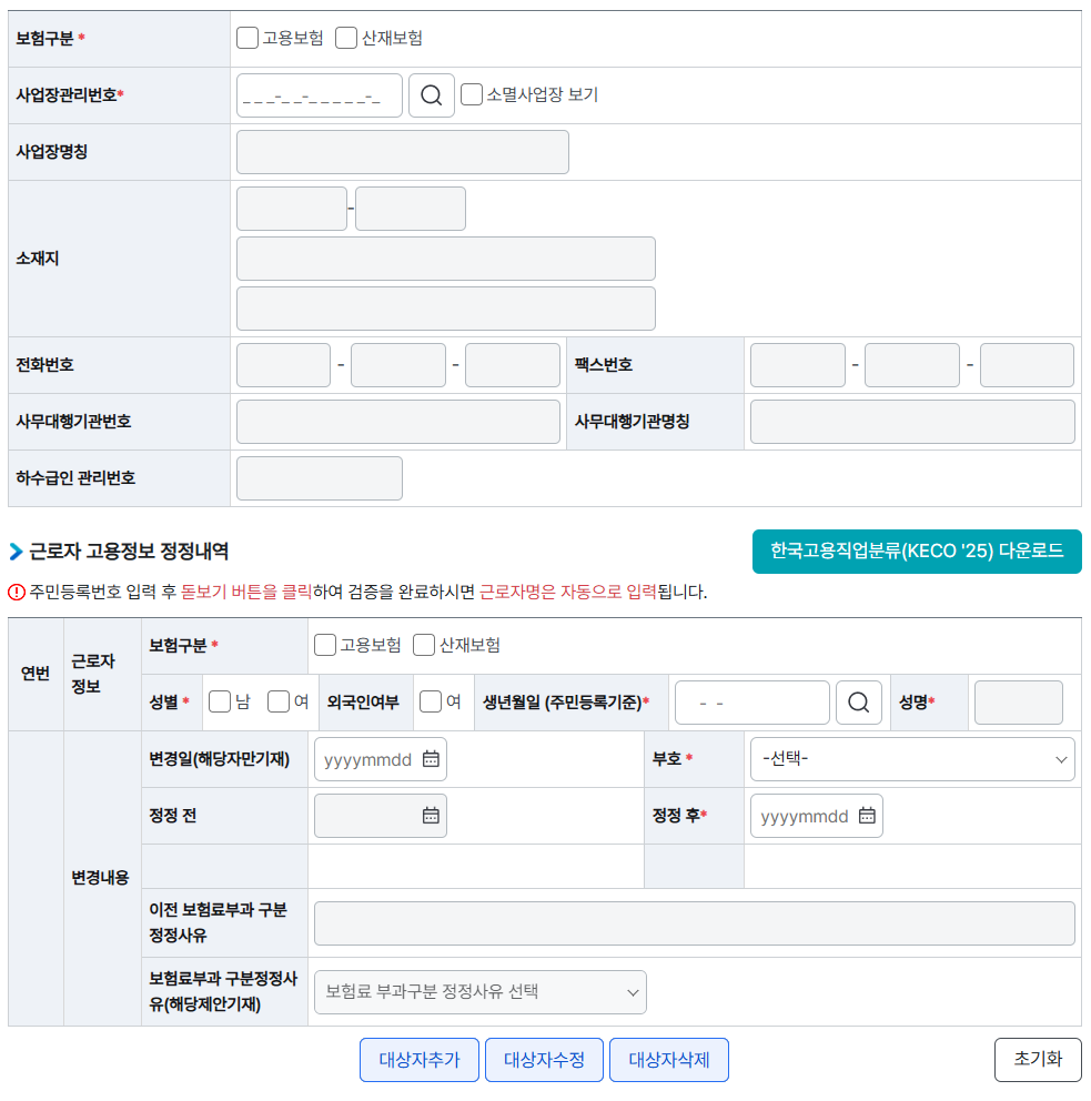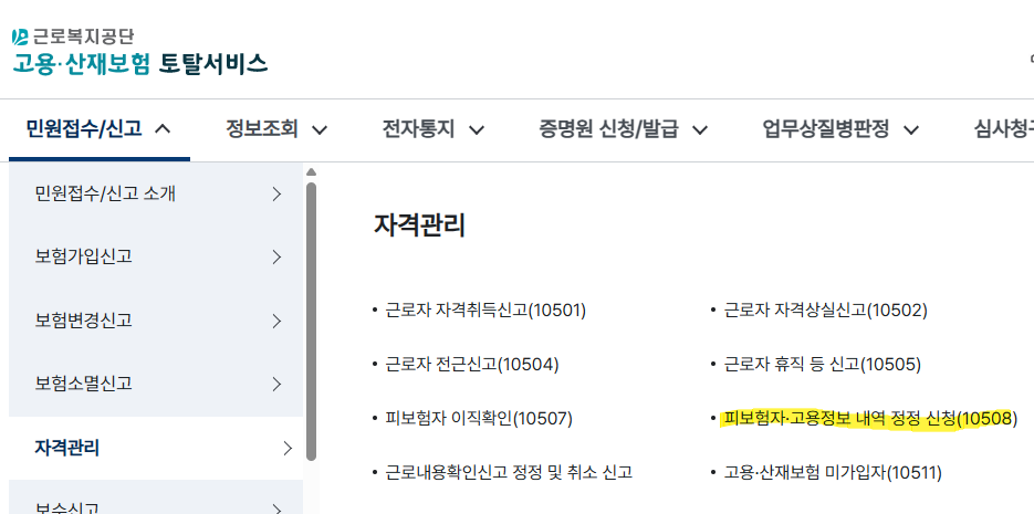 3. 민원접수 > 자격관리 > 피보험자 고용정보 내역 정정 신청 10508
