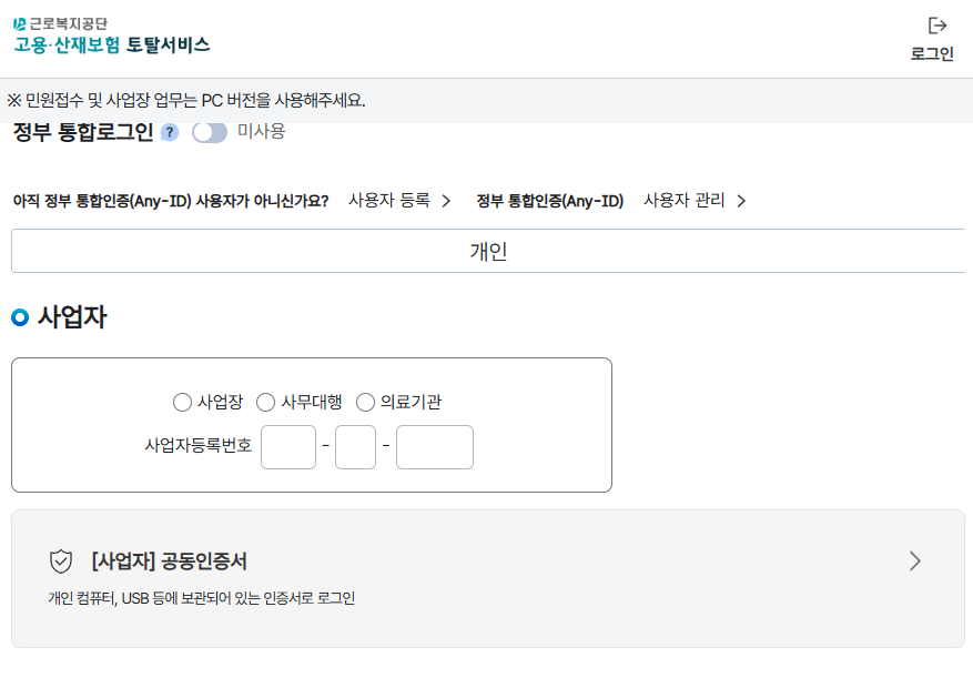 2. 사업장 로그인 (사업자 번호 입력, 공인인증서 로그인)