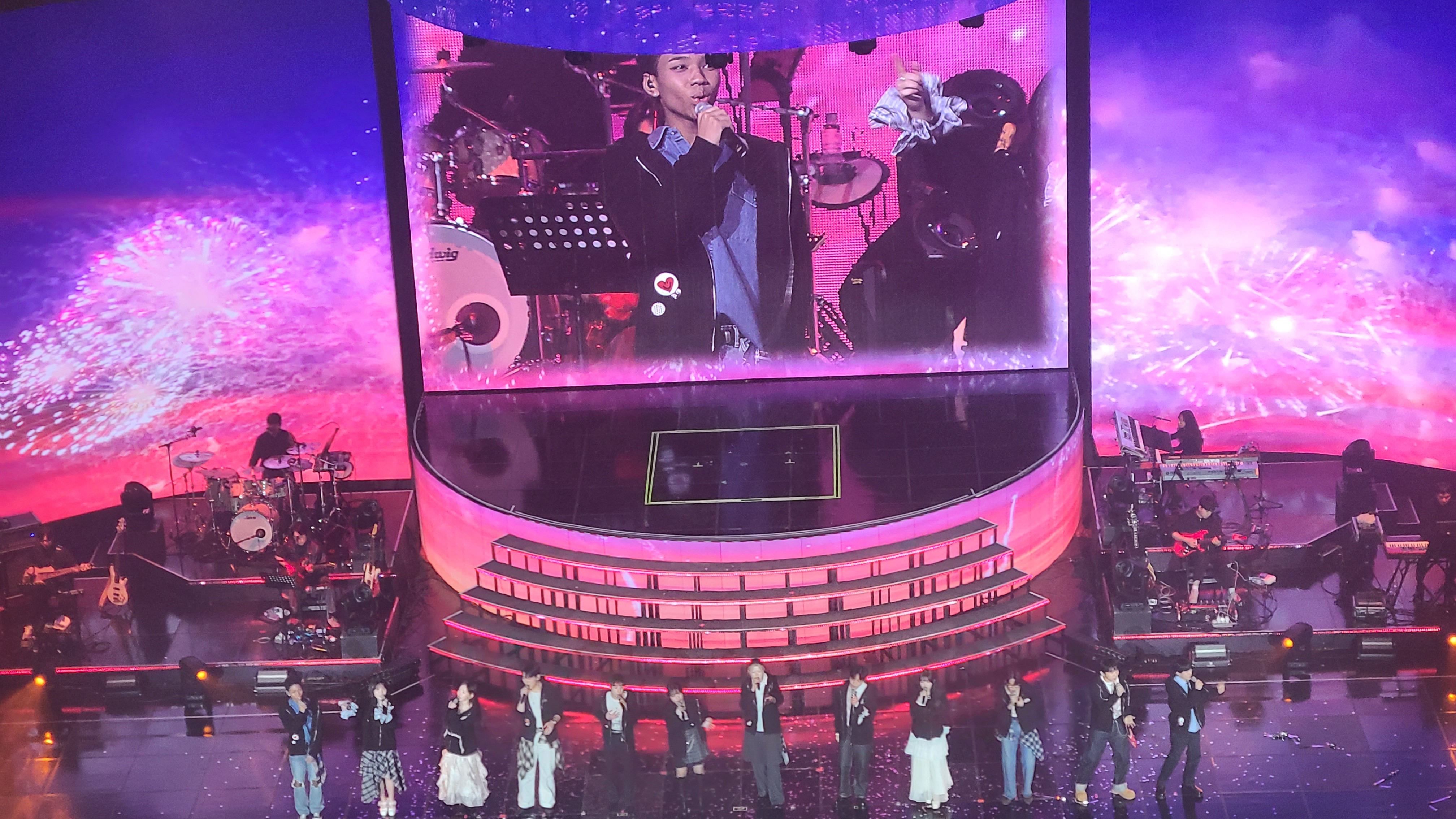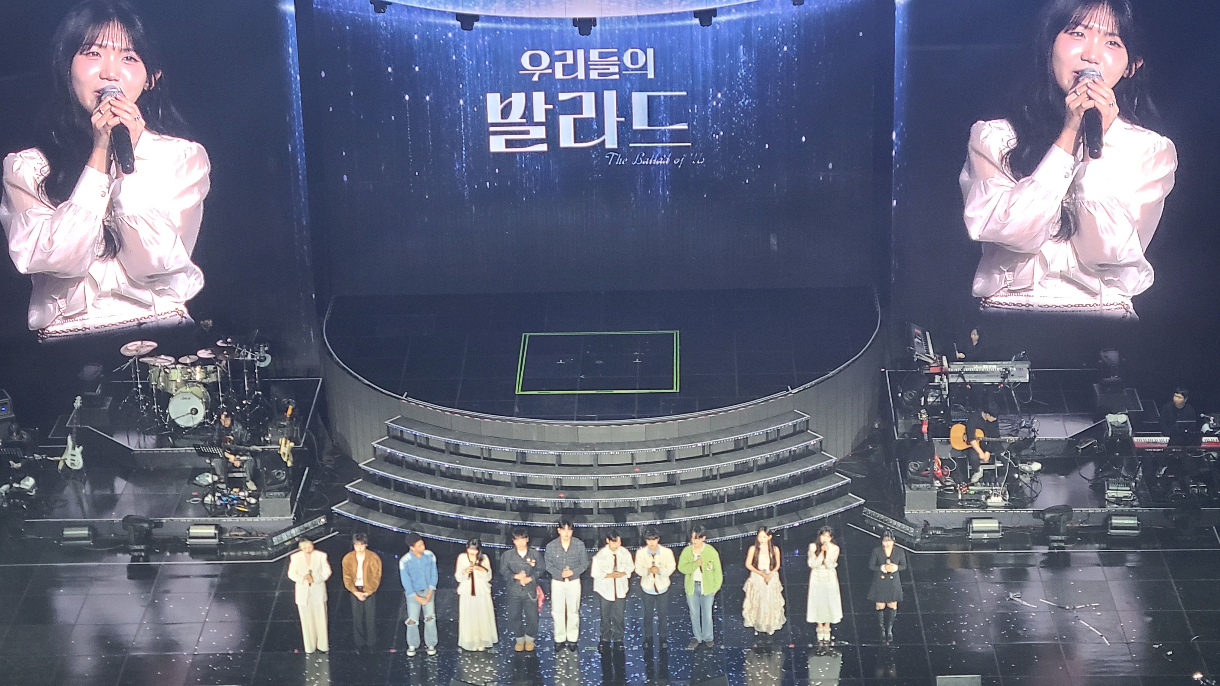 12명의 최종 가수들 사진 플랜카드가 전면에 크게 걸려 있습니다.